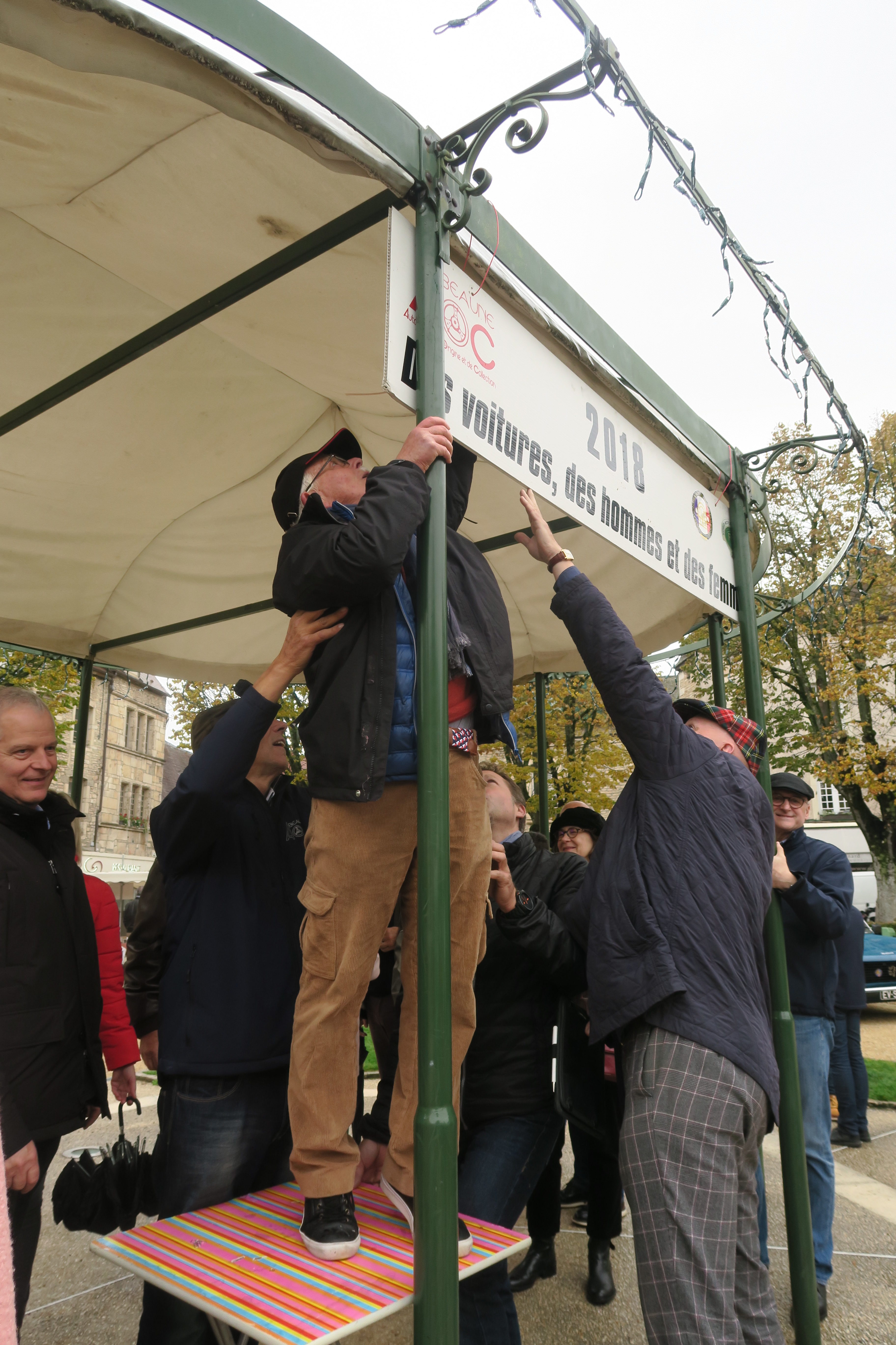 On choisit le plus grand pour accrocher la nouvelle banderole. Le Président nous raconte ensuite comment une DS sans chauffeur peut arriver à défoncer les 2 portières d'une belle Mercedes sagement garée en stationnement: